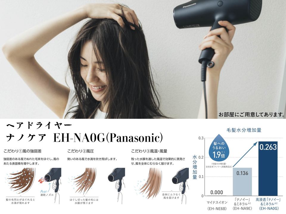 高浸透「ナノイー」が搭載され、さらに従来品よりミネラルマイナスイオン発生量が2倍になったため、乾かすだけで、髪の内側までうるおいが届き、髪の広がりやくせ・うねりを抑え、美しくまとまりのある髪に仕上がります。